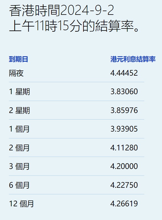 智通财经APP获悉,港元拆息在9月首个交易日个别发展,其中,隔夜息大涨报4.44452%,创一个月新高,而与楼按相关的一个月拆息亦连升三天,报3.93905%,续见8月26日以来最高。