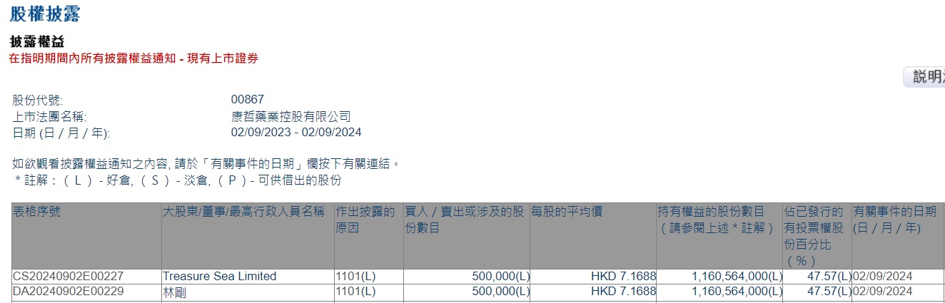智通财经APP获悉,香港联交所最新资料显示,9月2日,Treasure Sea