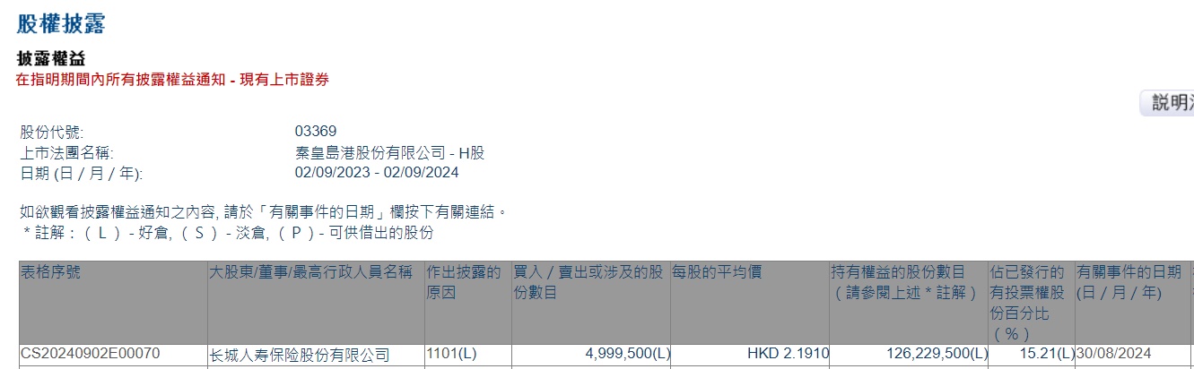 智通财经APP获悉,香港联交所最新资料显示,8月30日,长城人寿增持秦港股份(03369)499.95万股,每股作价2.191港元,总金额约为1095.39万港元。增持后最新持股数目约为1.26亿股,持股比例为15.21%。