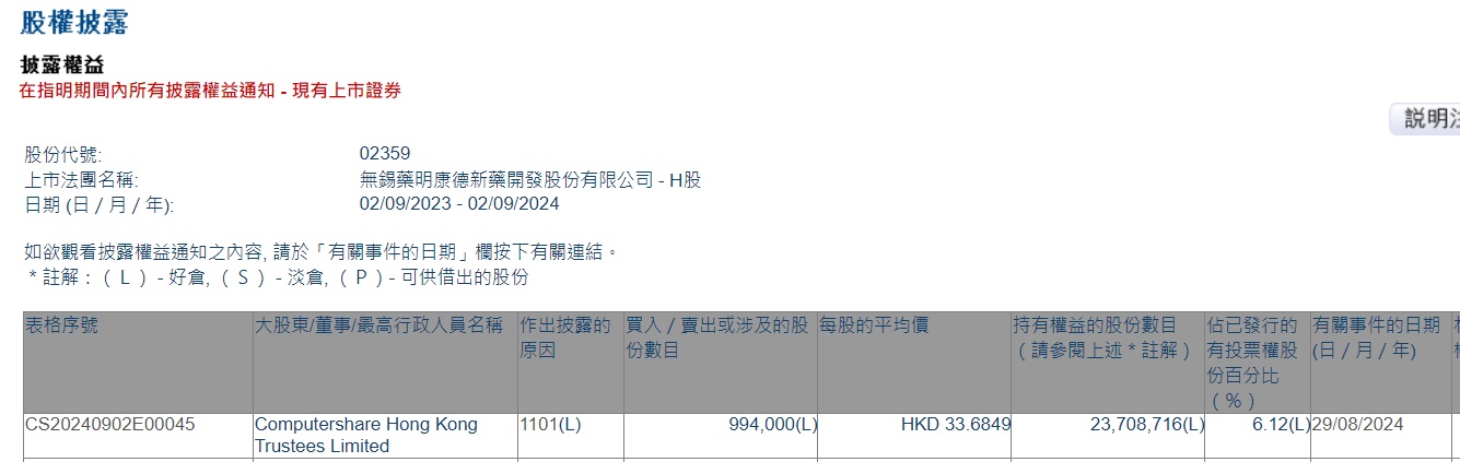 智通财经APP获悉,香港联交所最新资料显示,8月29日,Computershare Hong Kong Trustees Limited增持药明康德(02359)99.4万股,每股作价33.6849港元,总金额约为3348.28万港元。增持后最新持股数目约为2370.87万股,持股比例为6.12%。