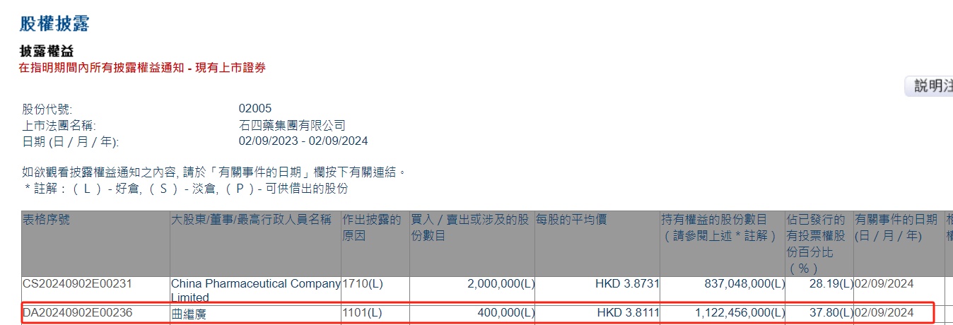 智通财经APP获悉,香港联交所最新资料显示,9月2日,主席兼执行董事曲继广增持石四药集团(02005)40万股,每股作价3.8111港元,总金额为152.444万港元。增持后最新持股数目约为11.22亿股,最新持股比例为37.8%。