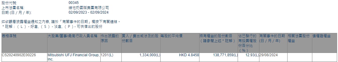 智通财经APP获悉,香港联交所最新资料显示,8月29日,三菱日联金融减持维他奶国际(00345)133.4万股,每股作价4.8458港元,总金额约为646.43万港元。减持后最新持股数目约为1.39亿股,持股比例为12.93%。