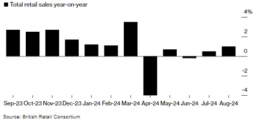 此外,巴克莱银行和英国零售商协会的数据显示,8月份的零售额增长受到了烧烤和“野餐天气”的推动。巴克莱银行表示,信用卡消费在8月份同比增长了1%,结束了连续两个月的下降趋势。同时,BRC表示,由于消费者利用晴朗的天气购买食品,零售总额也增长了1%,这是自3月份以来表现最强劲的一次。