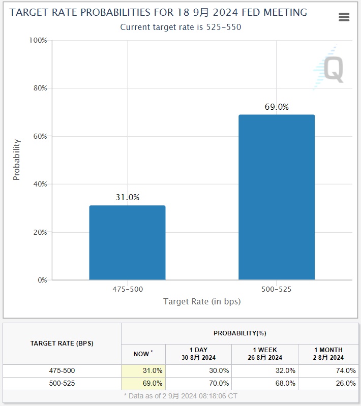 CME Fedwatch Tool的数据显示,目前,市场认为美联储本月会议上降息25个基点的可能性接近70%,降息50个基点的可能性为31%。