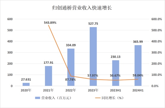 近几年来,归创通桥的营收增长表现十分亮眼。2021年至2023年营收同比分别达到548%,88%和58%,2024H1继续保持59%的增长幅度。