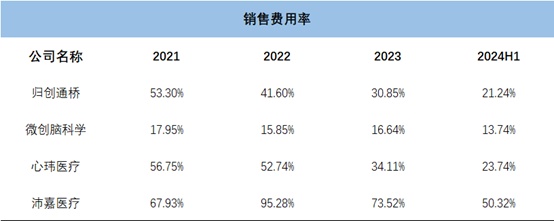 从上述表格可以看出,在集采的政策下,几家国产医疗器械企业毛利率都出现不同程度的下滑,相应的销售费用率也都有所下降,上半年沛嘉医疗、心玮医疗及归创通桥销售费用率下降明显。