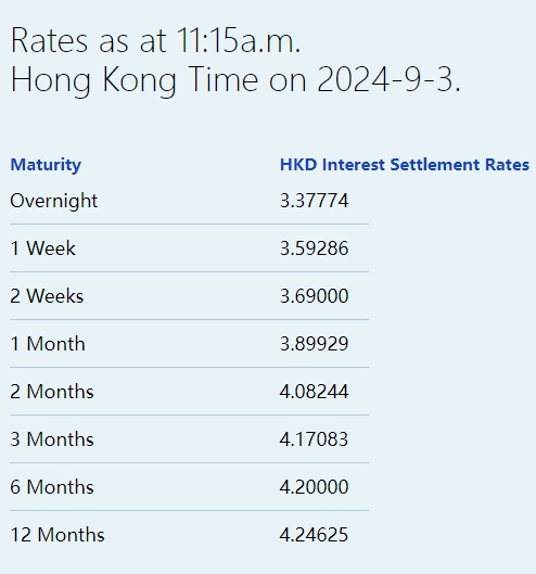 智通财经APP获悉,9月3日,港元拆息全线下跌,其中,隔夜拆息大起大落,继昨日大涨102基点后,今日又回落106基点,报3.37774%,而与楼按相关的一个月拆息亦中止三连升,报3.89929%,创近一年新低。