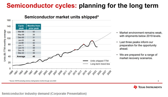然而,半导体行业远不止是用于这些特定应用的各种芯片。事实上,正如德州仪器最近向投资者展示的这张幻灯片所示,整个行业仍处于几十年来最大的周期性衰退之一: