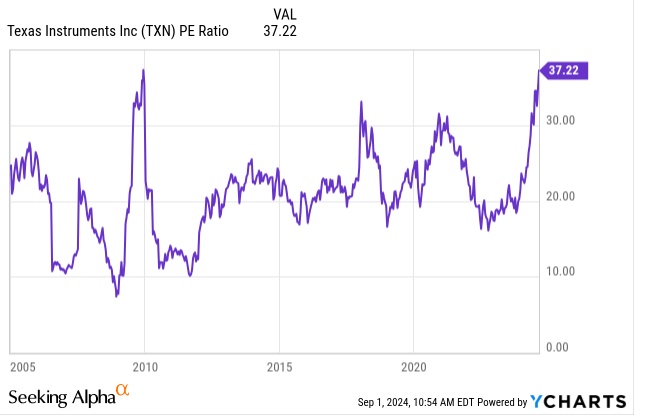 综上所述,德州仪器目前的盈利业绩并不特别乐观。再加上创纪录的高股价,这最终为德州仪器带来了市盈率超过37倍的高估值,是其2024年预期收益的40倍。这也使得该股接近至少过去20年来的最高估值: