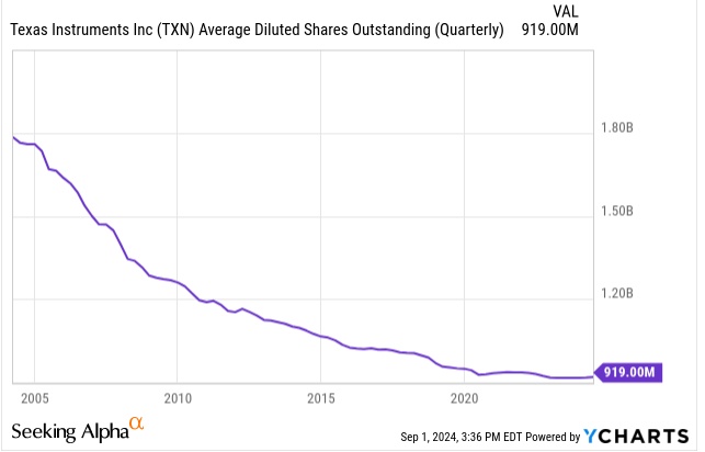 此外,德州仪器在过去二十年里通过其持续的股票回购计划为股东创造了巨大的价值。