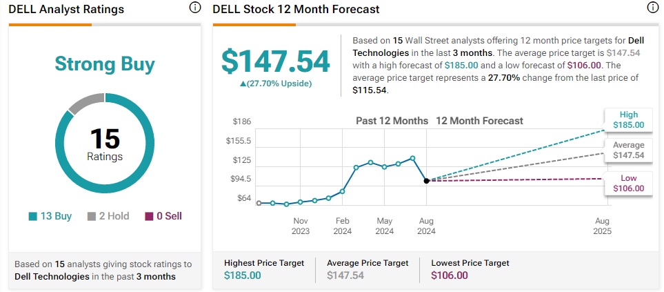 不过,戴尔最近的业绩表现更为亮眼,分析师们也对其持乐观态度。TipRanks数据显示,总体而言,华尔街分析师予戴尔“强力买入”评级,平均目标价为147.54美元,较当前水平高出28%。