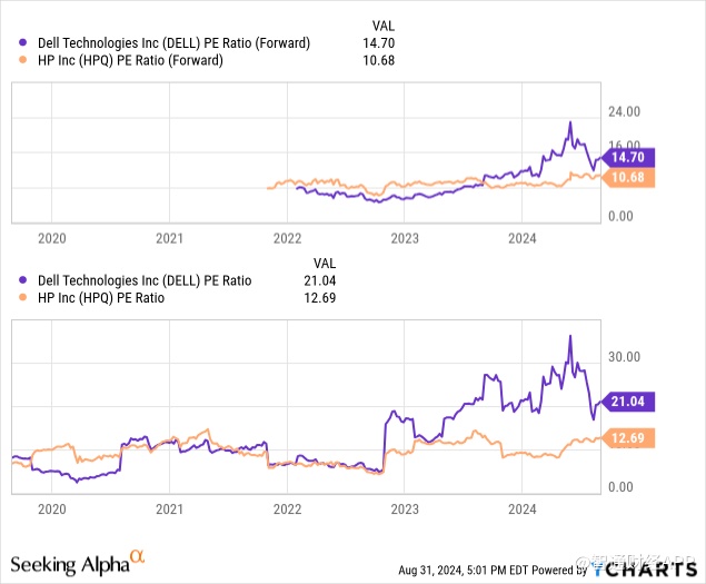该股的市盈率高于其近期平均水平和惠普(HPQ.US)等竞争对手,如下图所示。