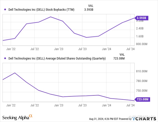 戴尔之所以能做到这一点,是因为其拥有充足的自由现金流,过去五年的自由现金流为240亿美元,上个季度为13亿美元,折合成年率为52亿美元。
