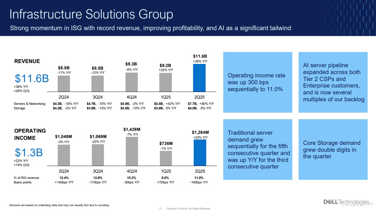 为数据中心客户提供服务的基础设施解决方案部门(ISG)的销售额达到116亿美元,同比增长33%,其中服务器和网络营收增长了80%。