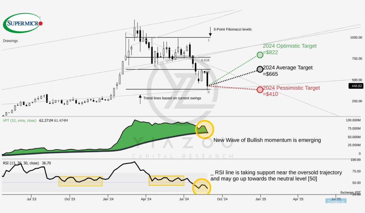 SMCI的股价已经从2024年3月的峰值大幅下跌。SMCI目前的价格为438美元,基于斐波那契回撤水平,SMCI在2024年的目标价显示更倾向于上行。乐观的目标位822美元,对应于0.618斐波那契回撤位,表明如果市场状况有利于反弹,将出现大幅上行。相反,410美元的悲观目标,反映了0.0的斐波那契基数,意味着如果市场变得不利,将有适度的下行风险。平均目标价655美元与0.382斐波那契回撤位一致,表明有温和的增长潜力。这些目标是通过斐波那契水平预测的短期趋势得出的,表明了广泛的潜在价格变动。