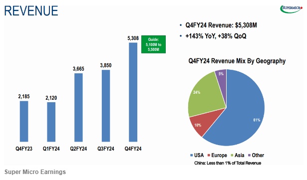地理趋势显示,SMCI的动态增长与地缘政治风险关联性小,来自美国的营收占第四季度总营收的61%,这标志着同比增长94%,季度环比增长20%。来自亚洲的收入同比增长437%,环比增长66%,占第四季度总收入的24%,表明市场扩张成功。