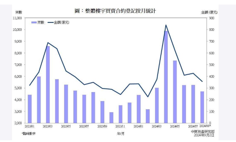 中原地产研究部高级联席董事杨明仪指出,香港2024年8月份整体楼宇买卖合约登记(包括住宅、车位及工商铺物业)录4720宗,总值356.35亿港元,较7月的5262宗及426.69亿港元,分别下跌10.3%及16.5%。撤辣效应消退,银行收紧按揭审批,再加上市场观望减息,买家的入市步伐明显减慢。8月数字跌破五千宗,宗数及金额同创今年2月后近6个月新低。