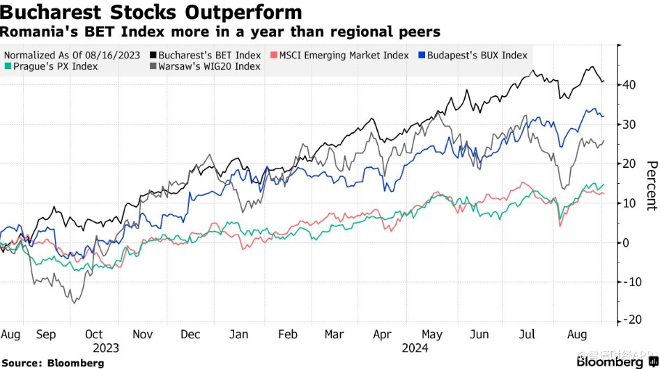虽然罗马尼亚传统上快速增长的经济已经放缓,但在利率下调和物价上涨放缓的推动下,经济有望复苏。在宏观前景不断改善的同时,人们押注这个东欧股市最早明年将被摩根士丹利资本国际公司(MSCI)升级为新兴市场。