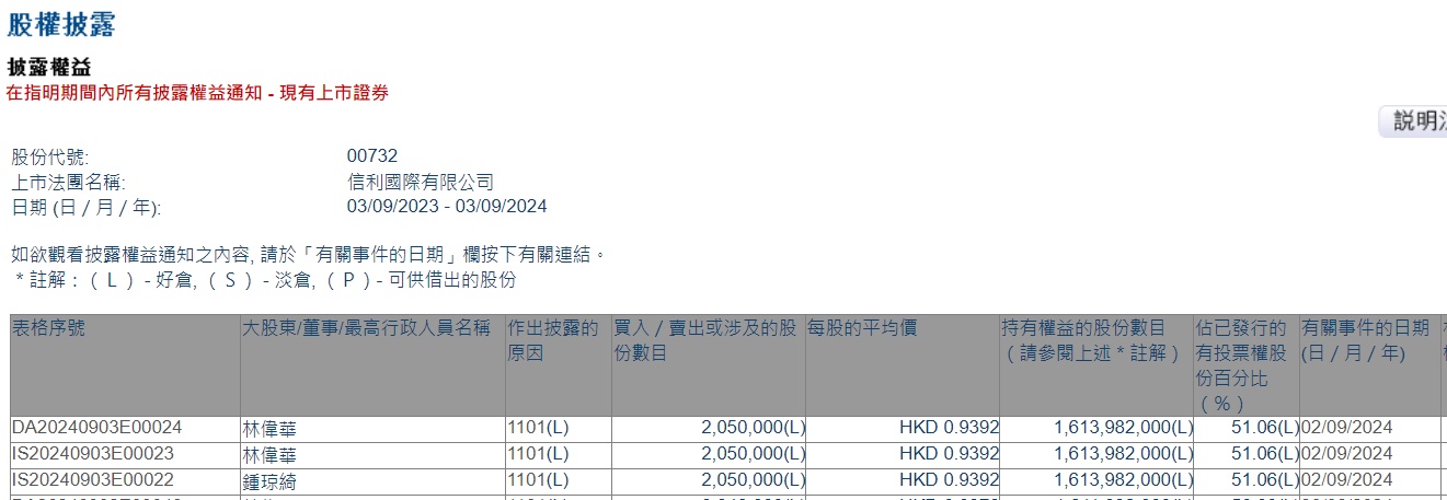 智通财经APP获悉,香港联交所最新资料显示,9月2日,集团主席兼执行董事林伟华增持信利国际(00732)205万股,每股作价0.9392港元,总金额为192.536万港元。增持后最新持股数目约为16.14亿股,最新持股比例为51.06%。