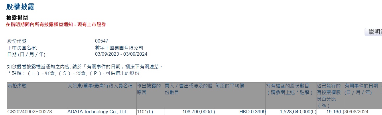 Ltd.增持数字王国(00547)1.0879亿股,每股作价0.3999港元,总金额约为4350.51万港元。增持后最新持股数目约15.29亿股,最新持股比例为19.16%。