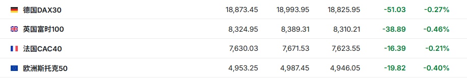 2. 截至发稿,德国DAX指数跌0.27%,英国富时100指数跌0.46%,法国CAC40指数跌0.21%,欧洲斯托克50指数跌0.40%。