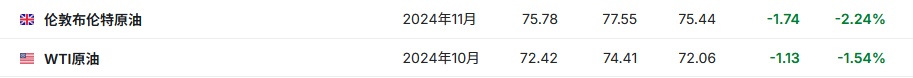 3. 截至发稿,WTI原油跌1.54%,报72.42美元/桶。布伦特原油跌2.24%,报75.78美元/桶。
