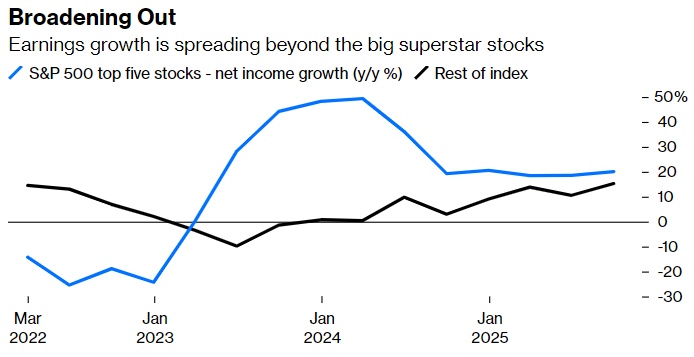 与此同时,除了科技巨头们的其他股票似乎正在迎头赶上。剔除前五大成份股,预计到2025年,标普500指数成份股公司的盈利增长将加速。