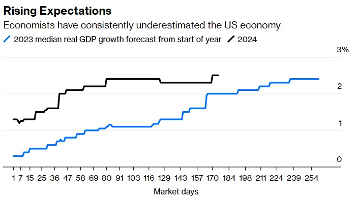 其次,经济学家和策略师们一直错误地判断了美国经济的实力。在2023年初,经济学家的预测中值显示,他们认为美国经济勉强能撑过2023年。但事实情况与此相反,美国经济增长了2.5%,而且看起来今年有望再次达到这一水平。大部分预测错误可能是过度依赖旧的经验法则,包括美联储加息通常会导致经济衰退的观点。在“正常”的经济周期中,这可能是正确的,但在疫情之后,美国经济的现实情况是雇主囤积劳动力,消费者不顾一切地回到餐馆和音乐会,而且房屋净值很高。经济学家可能还低估了人工智能军备竞赛带来的资本支出以及拜登总统的产业政策对宏观经济的影响。