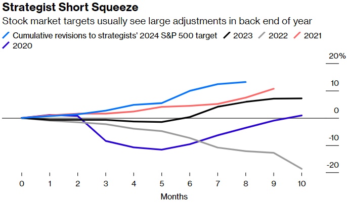 智通财经获悉,美国市场与经济专栏作者Jonathan Levin表示,自疫情以来,华尔街策略师在年初时的年度预测中一再低估了美国股市的表现,进而促使他们在下半年接近年底的时候疯狂调高对美股的年度目标预测。一连串的向上修正可能看起来有点像“轧空”,这是一种交易员被迫快速连续回补看跌押注的情况,通常会加强证券的上行势头。从这个意义上说,策略师们今年已经经历了10年来最大规模的轧空,而季节性趋势表明,未来几个月这种情况可能将持续下去。