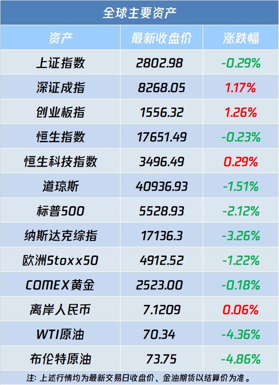 自选哥提示:隔夜美股大幅收跌,制造业数据令股指承压,纳指重挫3%领跌三大指数,英伟达大跌超9%市值一夜蒸发2万亿。其他市场方面,COMEX黄金期货跌0.18%,报2523.00美元/盎司;纽约商品交易所10月交货的轻质原油期货收于每桶70.34美元,跌幅为4.36%;11月交货的伦敦布伦特原油期货收于每桶73.75美元,跌幅为4.86%。