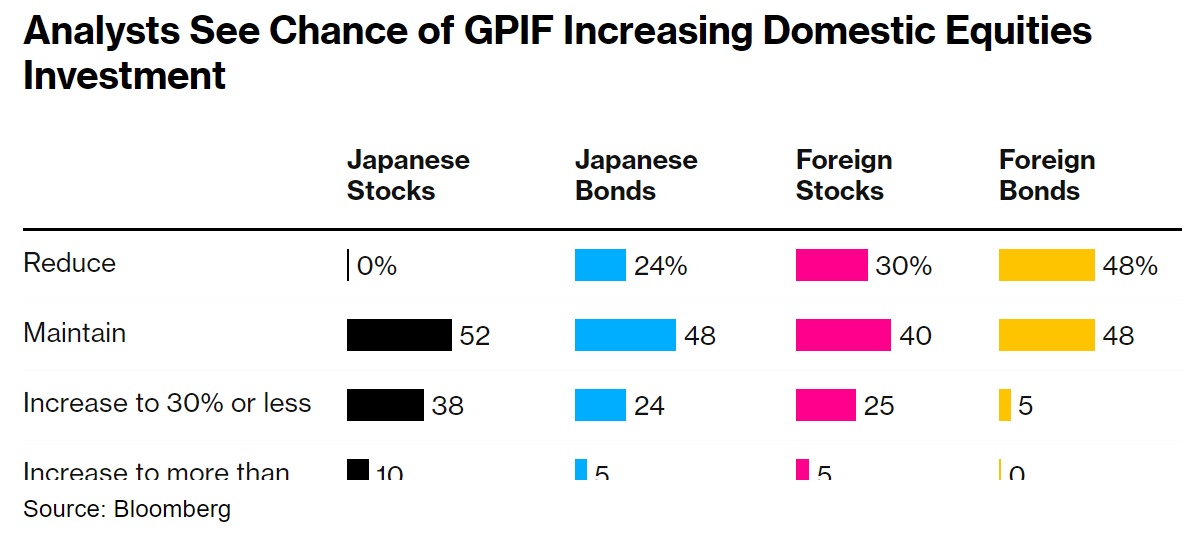 接受调查的 21 位分析师中,近半数表示,作为 4 月份投资组合调整的一部分,政府养老金投资基金(GPIF)将把日本股票的配置目标提高到目前的 25% 以上。他们表示,增加外国债券配置的可能性极小,因为这将涉及日元出售,从而可能削弱日元。