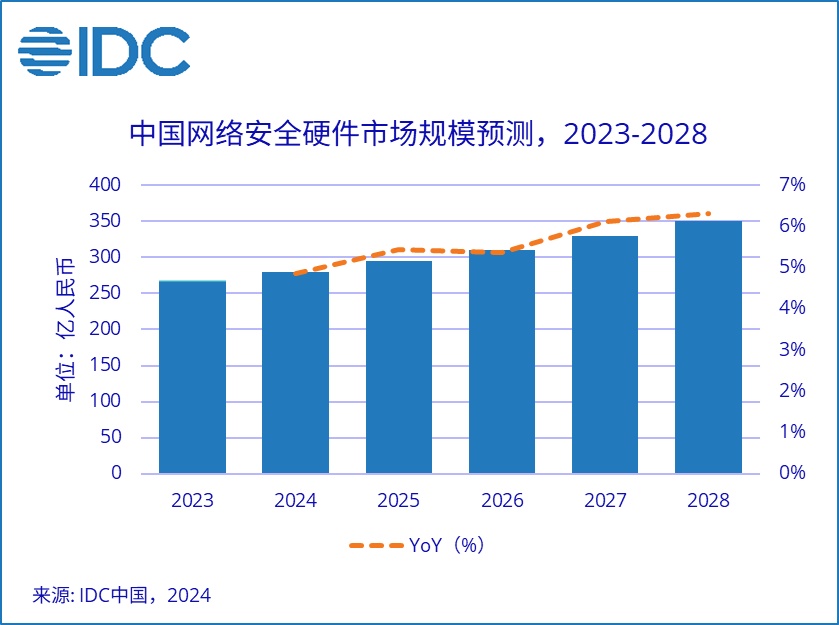 智通财经APP获悉,IDC于近日发布《IDC Market Forecast:中国IT安全硬件市场预测,2024-2028》报告。报告中预测,网络安全硬件市场作为整个网络安全生态系统中的重要组成部分,2024年,该市场的规模将达到280亿人民币。到2028年,中国网络安全硬件市场规模将达到350亿人民币,年复合增长率将达到5.6%。IDC表示,尽管面临诸多挑战,网络安全仍然是组织和企业在数字经济时代中不可或缺的一环。随着数字化转型的深入进行,网络安全的重要性只会与日俱增。因此,即便是在经济困难时期,网络安全市场依然有着强劲的增长潜力。据IDC的最新预测,到2028年,中国的网络安全相关支出预计将增长至1,414亿元人民币,在未来五年内,该市场的年复合增长率将达到11%。