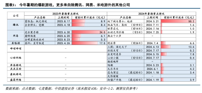 以新游表现来说,2024年的夏天各大游戏公司的新作品大有百花齐放的态势。除了文首提到的《黑神话:悟空》外,包括B站、心动等公司均有爆款游戏推出,根据点点数据,预估《三国:谋定天下》首月流水14亿,《出发吧麦芬》首月流水8亿,表现均相对出色。