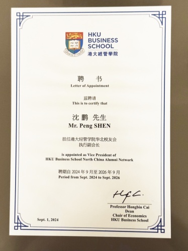 图:沈鹏获聘担任香港大学经管学院华北校友会执行副会长