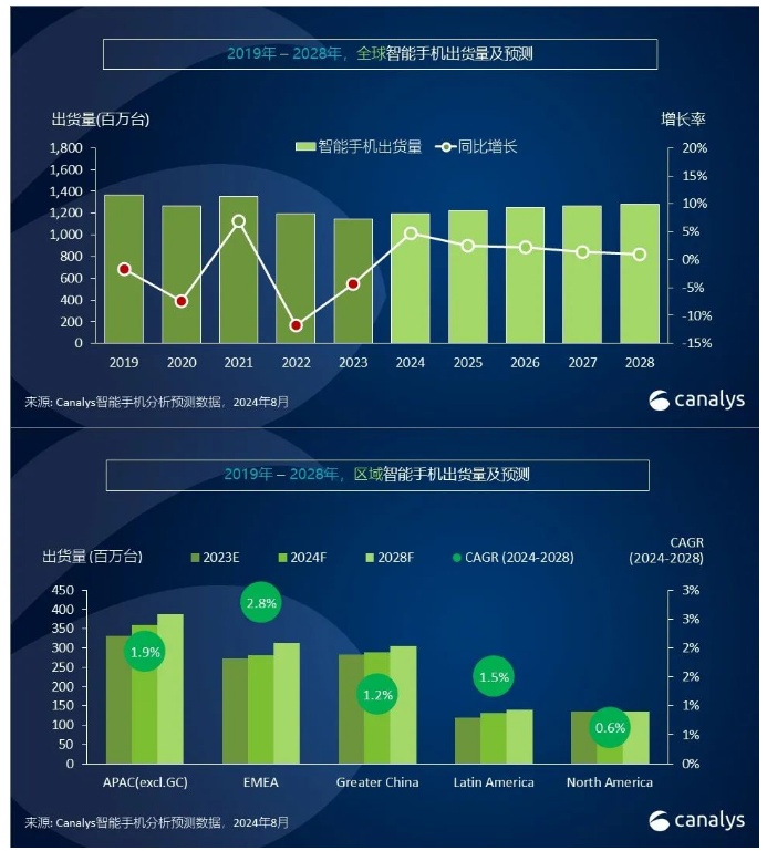 智通财经APP获悉,Canalys发文称,2024年第二季度,全球智能手机市场景气度持续提升,尽管增长好于预期,基于成本上涨,库存周转,营商环境带来的挑战,Canalys仅小幅上调2024年全球智能手机出货量预测至12亿台,同比上升5%。区域层面,新兴市场仍然是带动整体市场复苏的重要支柱,但部分市场下半年将面临宏观不确定性风险以及竞争的加剧。长期来看,智能手机市场的年增长率将在今年的强势反弹后逐步进入平台期,2024年至2028年将以2%的年复合增长率温和成长。