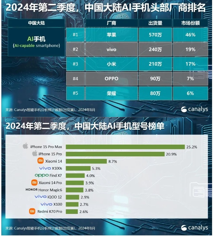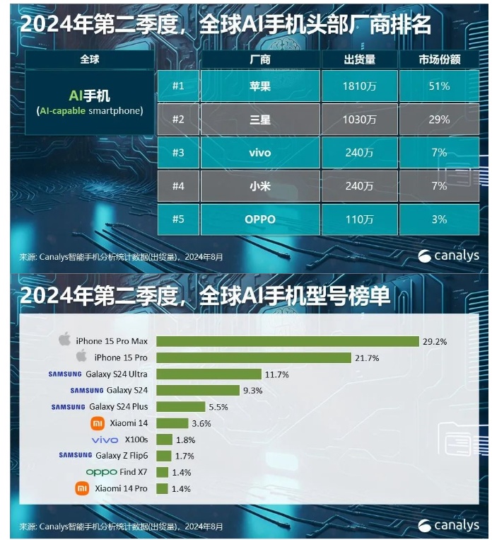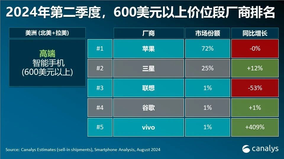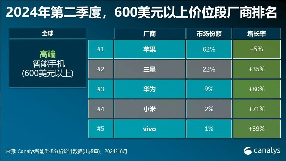 高端手机市场需求仍然保持韧性,二季度全球600美元以上出货量前五厂商皆保持同比增长。苹果(APPL.US)通过其Apple Intelligence服务的推出重燃市场关注,并扭转一季度的下跌,在二季度同比增长5%,以62%的份额稳居高端市场首位。三星Galaxy S24需求延续,出货同比增长35%,以22%的市场份额位居第二。华为在其Pura系列新品的推动下在本土市场延续了强劲的复苏势头,同比增长80%,以9%的全球市场份额位列第三。小米(01810)凭借其14系列的持续需求,同比增长71%,出货量位居第四。vivo在其本土市场实现了强势增长,并凭借X系列折叠旗舰在高端领域进一步扩大市场份额,位列第五。
