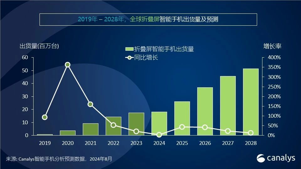 折叠屏手机市场仍需探索新的需求催化剂,Canalys预计2024年折叠屏手机出货量将进一步走低,同比仅增长3%,出货量约1800万台。但生成式AI、新产品形态以及潜在新玩家的加入有望重燃该品类的成长,预计2024年至2028年,折叠屏手机出货仍将以30%年复合增长率增长至5100万台。
