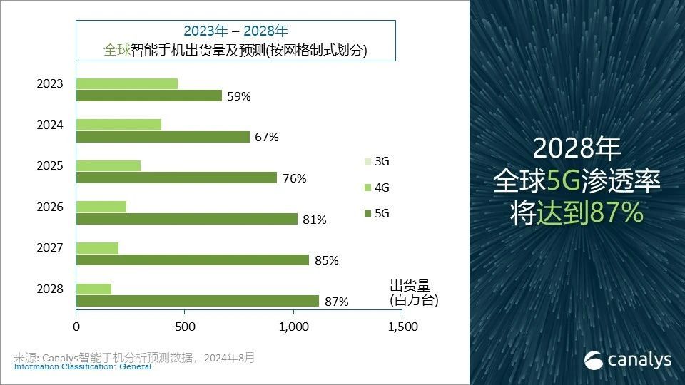 智能手机市场5G渗透仍在稳步推进,预计2024年5G智能手机出货占比将达到67%,而到2028年这一数字将上升至87%。