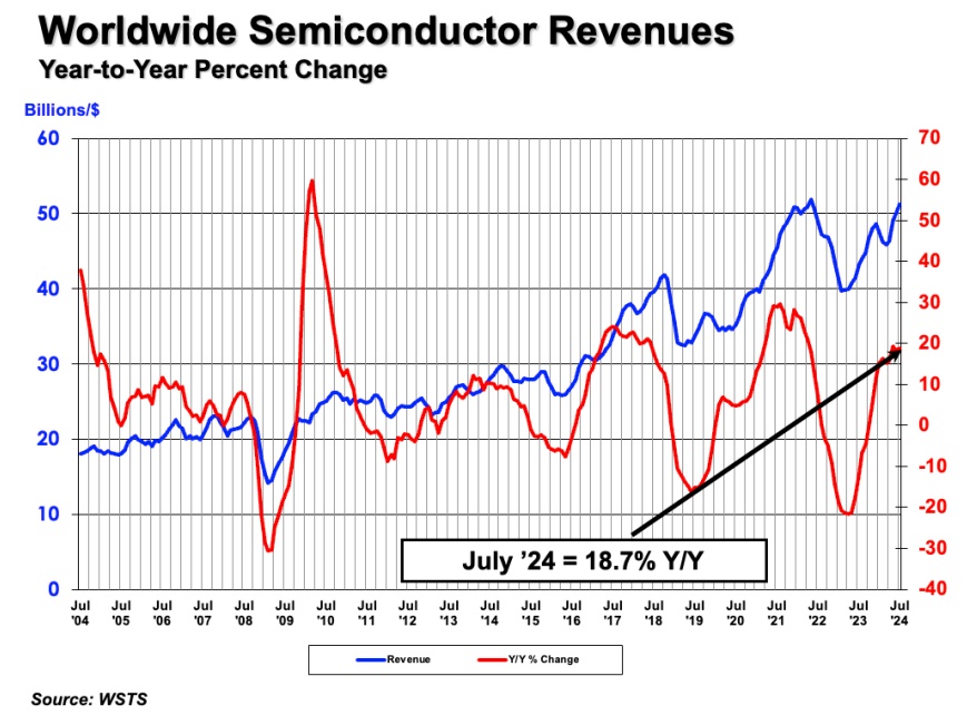 由AI芯片引领的这一波芯片行业复苏趋势可谓愈发明朗,美国半导体行业协会 (SIA) 近日公布的数据显示,2024 年第二季度全球半导体行业销售总额高达1499 亿美元,相比2023年第二季度增长18.3%,比本已强劲的2024 年第一季度增长6.5%。 7月全球半导体行业销售额则达到 513 亿美元,较 2023 年 7 月增长 18.7%,相较2024 年 6 月的 500 亿美元则环比增长 2.7%。