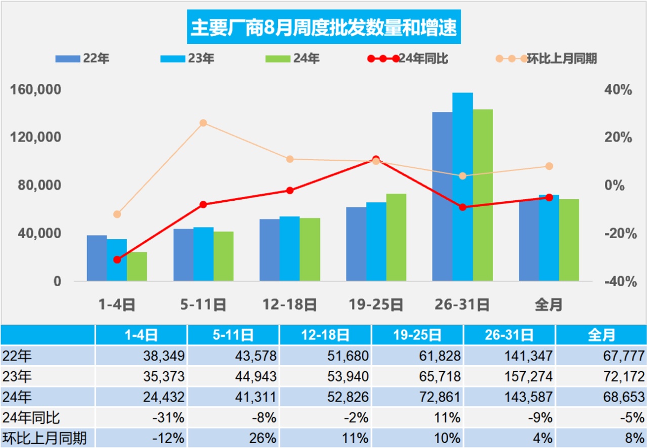 8月第五周乘用车厂商批发日均14.4万辆,同比去年8月同期下降9%,环比上月同期增长4%。
