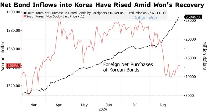 智通财经获悉,韩国金融监督院(Financial Supervisory Service)的数据显示,周二流入韩国债券的外国资金激增,净买入额超过10亿美元,为去年11月以来的最高水平。海外投资者已经连续14天净买入韩国国债,创下5月以来最长的连续买入纪录。德意志银行金融投资公司(DB Financial Investment)表示,资金流入可能是由于对韩元进一步走强的预期,以及韩国债券可能被纳入富时罗素的全球政府债券指数(World Government Bond Index),而在此背景下,美联储降息押注总体上增加了新兴亚洲资产的吸引力。