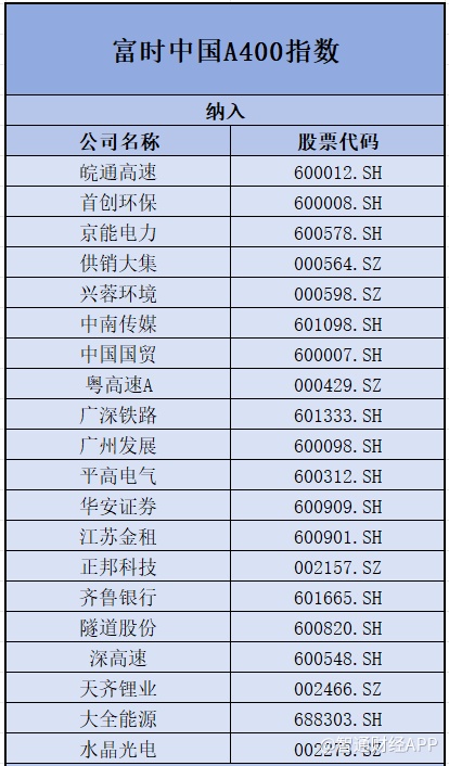 富时中国A400指数成分股将纳入皖通高速(600012.SH)、首创环保(600008.SH)等共20只股票,同时剔除鹏鼎控股、太极集团(600129.SH)等共20只股票。