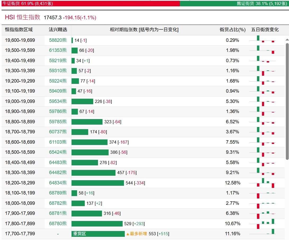 法兴恒指牛熊证街货分布图中的数据显示,熊证街货重货区和最多新增都在17700-17799区间,该区间最新熊证数量为553张,较上一交易日增加515张。