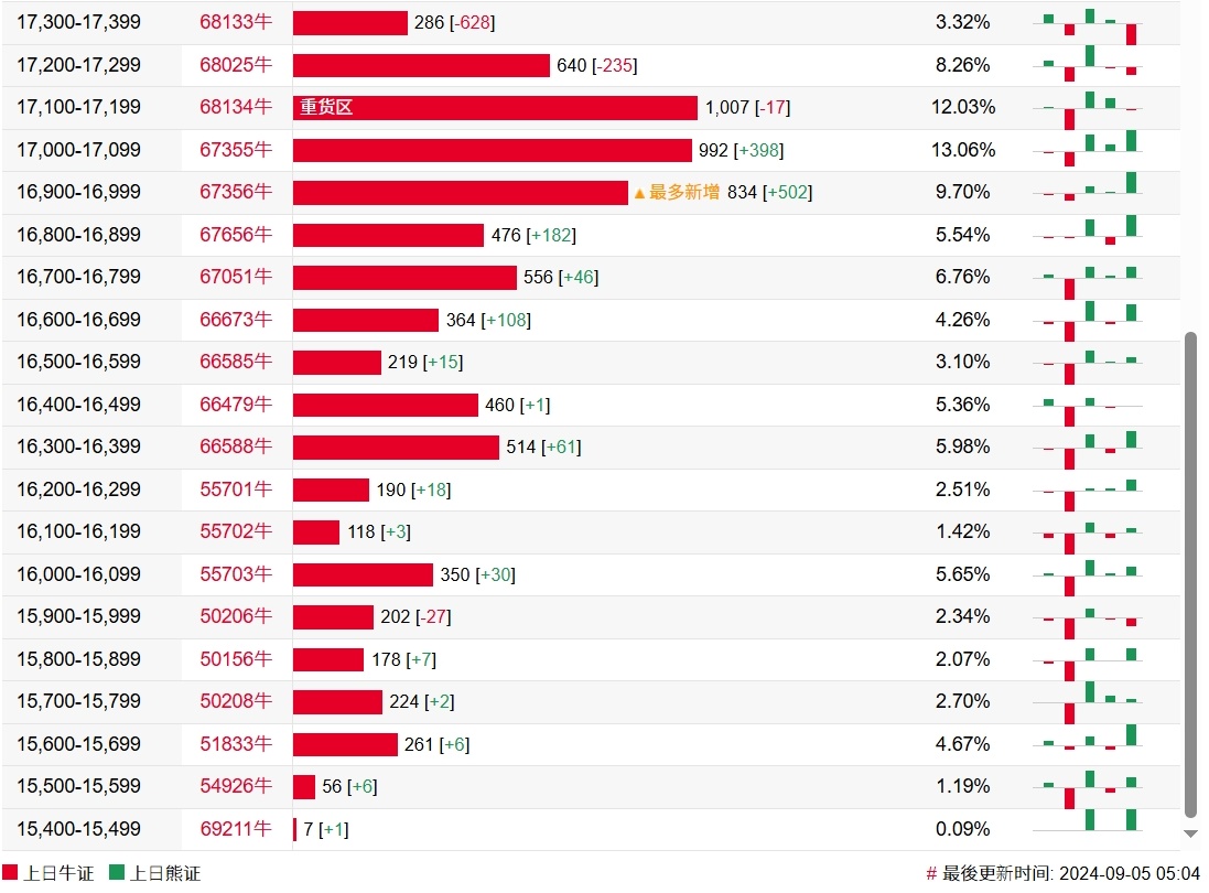 牛证街货重货区在17100-17199区间,该区间最新牛证数量为1007张,较上一交易日减少17张;最多新增在16900-16999区间,该区间最新牛证数量为834张,较上一交易日增加502张。