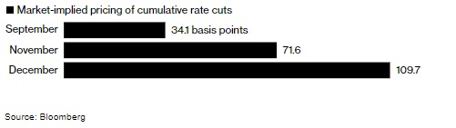 市场参与者正在加大对美联储在9月会议上大幅降息的押注。利率互换市场显示,交易员已经完全消化了美联储本月降息25个基点的预期,并且超过30%的可能性认为降息幅度将达到50个基点。此外,预计今年剩余的三次政策会议将总共降息110个基点。