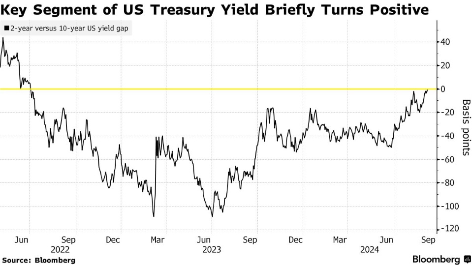 智通财经APP获悉,美国国债收益率曲线的一个关键部分在近期短暂转为正值,这一现象通常预示着经济前景的改善。这一转变的背后,是市场对美联储可能采取更大幅度降息措施的预期增强,这一预期受到了最新公布的弱于预期的劳动力市场数据的推动。