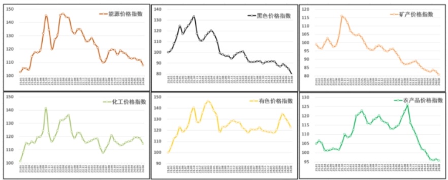 分行业看:黑色价格指数延续跌势,报79.4点,月环比下跌5.9%,年同比下跌13.3%;有色价格指数回吐涨幅,报122.6点,月环比下跌3.8%,年同比上涨1.6%;化工价格指数继续回调,报114.4点,月环比下跌3.4%,年同比下跌0.5%;能源价格指数跌幅扩大,报107.7点,月环比下跌3.6%,年同比下跌8.7%;矿产价格指数整荡下行,报80.7点,月环比下跌2.4%,年同比下跌7.3%;农产品价格指数低位震荡,报95.7点,月环比下跌0.7%,年同比下跌21.9%。