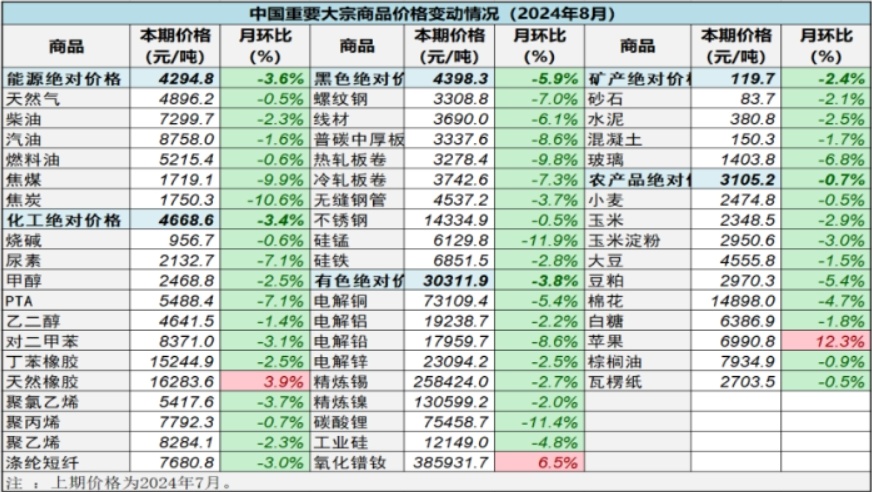分商品看:在中国物流与采购联合会重点监测的50种大宗商品中,本月价格与上月相比,47种(94%)大宗商品价格下跌,3种(6%)大宗商品价格上涨。其中,涨幅前三的为苹果、氧化镨钕和天然橡胶,月环比分别上涨12.3%、6.5%和3.9%;跌幅前三的大宗商品为硅锰、碳酸锂和焦炭,月环比分别下跌11.9%、11.4%和10.6%。