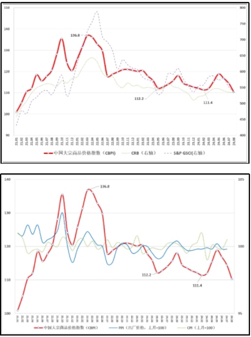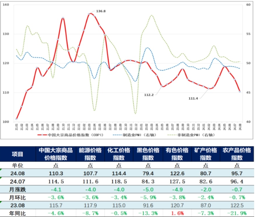智通财经APP获悉,由中物联大宗分会和上海钢联等单位联合调查,中国物流与采购联合会发布的2024年8月份中国大宗商品价格指数(CBPI)为110.3点,环比下跌3.6%,同比下跌4.6%。从指数运行情况来看,8月份CBPI受全球高温多雨天气、部分行业生产淡季,以及金融市场剧烈振荡等因素影响,大宗市场季节性阶段性波动特征明显,随着进入“金九银十”生产建设旺季,各项宏观调控政策的落实到位,预计市场需求将逐步回暖。从国内外大宗商品指数走势来看,企业生产成本压力有所缓解,同时美联储降息预期可能性增大也对大宗商品价格形成支撑,预计市场下行空间有限,但有效需求不足、企业经营压力较大等问题仍比较突出,流通业在引导生产、促进消费中的作用仍有待进一步发挥。