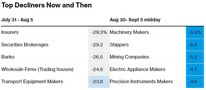 8月金融股以两位数百分比跌幅领跌日本股市大盘,但金融股近几日的疲势较为温和,且更多集中在半导体相关股和有大宗商品市场敞口的公司。9月份头三个交易日的市场成交量也较上月同期下降了约43%。